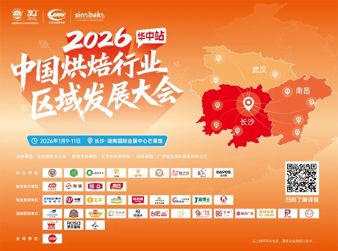 为深度推进中国烘焙行业区域协同发展与产业转型升级,聚合行业优质资源,赋能区域市场创新实践,由全联烘焙业公会和亿合烘焙商学院联合主办、广州博泓国际展览有限公司承办的“2026中国烘焙行业区域发展大会(华中站)”将于2026年1月9日至11日在长沙·湖南国际会展中心芒果馆隆重举办。